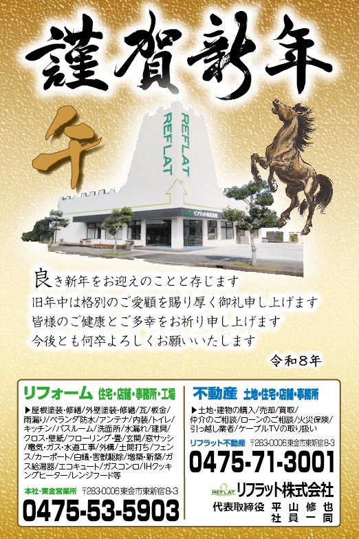 ~新年のあいさつ~ 良き新年をお迎えのことと存じます 旧年中は格別のご愛顧を賜り暑く御礼申し上げます 皆様のご健康とご多幸をお祈り申し上げます 今後とも何卒よろしくお願いいたします 令和8年 元旦 リフラット株式会社 代表取締役 平山修也 社員一同