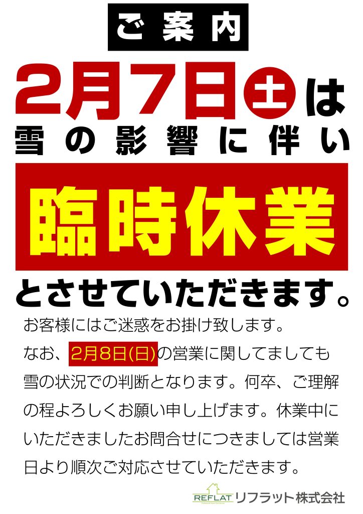 2月7日(土)は雪の影響に伴い臨時休業とさせていただきます。