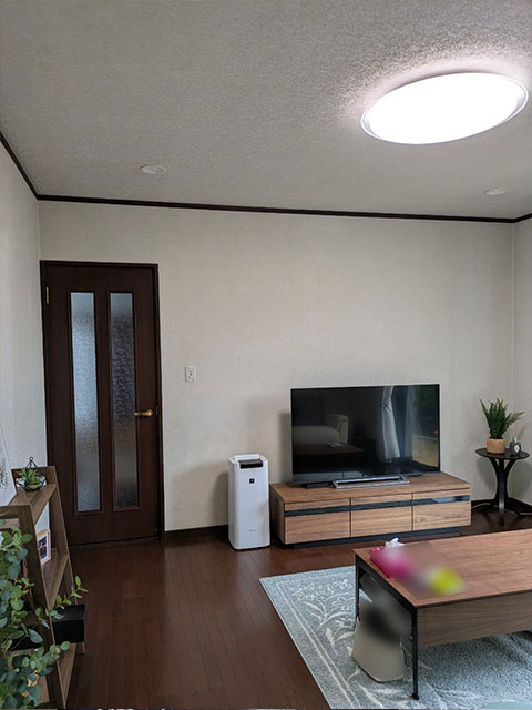 クロスの張り替えでは、壁の一面にサンゲツの77-4060をアクセントとして使用し、その他の壁には77-4006を採用しました。77-4060は落ち着いたグレー色で上品な雰囲気を演出し、空間に奥行きを与えます。77-4006は明るくやわらかなホワイト系で、清潔感と開放感を感じさせます。組み合わせることで、シンプルながらも印象的な仕上がりとなり、毎日使う空間にちょうど良い心地よさが生まれました。ダイニングキッチンの方もあわせて張り替えを行い綺麗になりました。