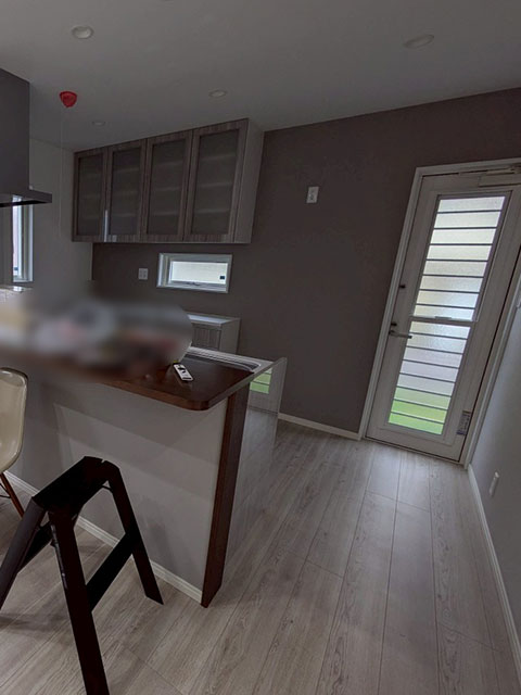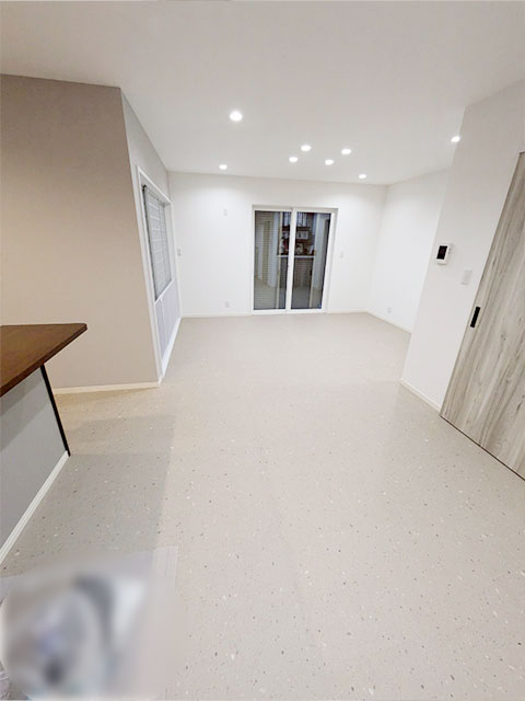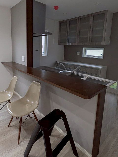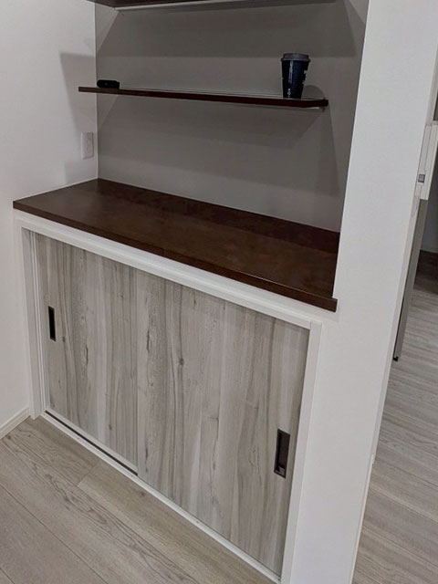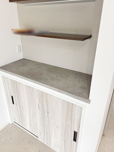 キッチンと居室の棚には、人気のモールテックス仕上げを採用しました。モールテックスはベルギー発祥の左官材で、コンクリートのような質感をもちながら防水性・耐久性に優れており、デザイン性の高さから「おしゃれなカフェ風」「高級感がある」といった声も多い仕上げです。LDKの床にはサンゲツの「ストーン&アクセント」シリーズのフロアタイルを上張りし、空間全体が一段階上の洗練された雰囲気に。素材感を活かした上質な仕上がりとなりました。