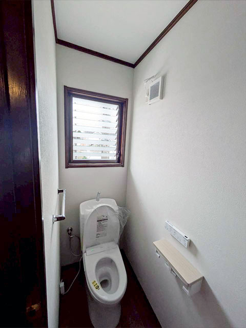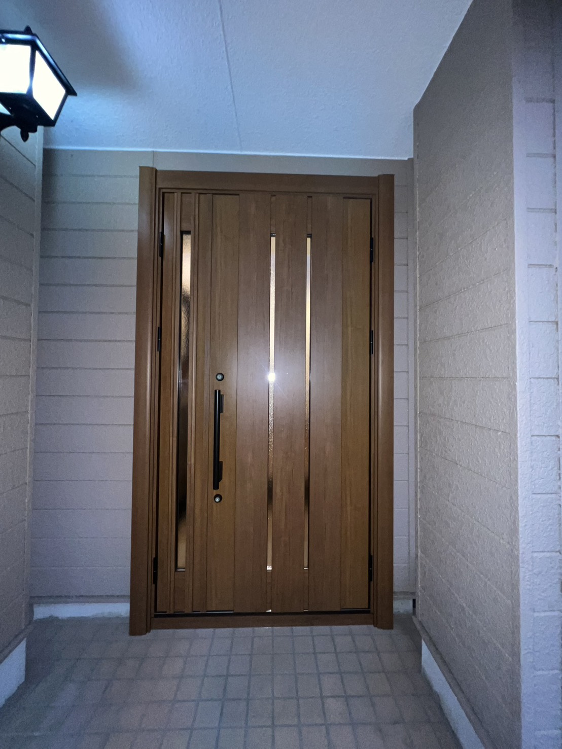 玄関は YKK AP ドアリモ D30 N10N(キャラメルチーク) を設置しました。1日で交換でき、防犯性の高い鍵と断熱仕様で、見た目も機能もぐっとアップ。明るくお洒落な玄関に生まれ変わりました。洗面台は タカラスタンダード ウイット(マットベージュ) を設置。汚れがつきにくいホーロー素材で、お手入れがラク。収納も十分でスッキリまとまります。トイレは TOTO ピュアレストQR ウォシュレットには アプリコットF1 を設置。少ない水量でしっかり流せる節水設計に加え、アプリコットの自動洗浄・脱臭機能で清潔さが長続きします。勝手口ドアは LIXIL リシェント L型(オータムブラウン) を採用。採光がしっかりととれ、格子が無い分お掃除が簡単、見た目もスマートになりました。住まい全体がより快適で過ごしやすい空間になりました。