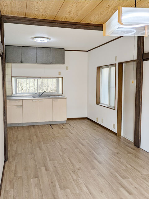 ダイニングと和室の壁を取り払い、畳・CFをはがし、フローリングに張りました。また壁紙も統一感が出る様白色に張り替え、部屋が明るく、広々と使いやすくなりました。また洋室化にともない備え付けの仏壇も撤去致しました。