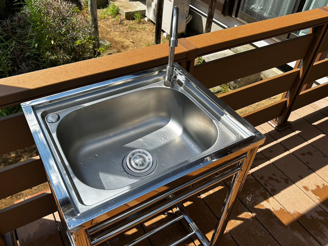 また、お客様のご希望でキウイ棚も設置。デッキ横で果実を育てながら季節の変化を楽しめる空間になりました。さらに簡易シンクも取り付け、ガーデニングやBBQ後の片付けにも便利。お庭時間がより快適になるリフォームになりました。
