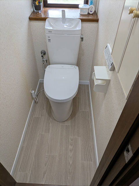 一方、New Passo EA23Aは自動開閉や温風乾燥など、快適機能を備えた上位モデル。きめ細かい洗浄とやさしい使い心地が魅力です。どちらも清潔性と使いやすさを兼ね備えたトイレになりました。あわせて洗面台にはLIXILピアラを設置。広々ボウルと使いやすい水栓で、毎日の身支度がぐっと快適になりました